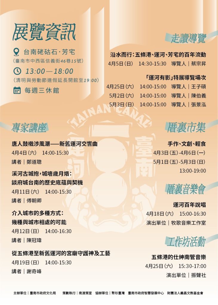 臺南運河百年影像展名為「運河有影—臺南運河百年紀念展」,於2026年4月2日下午1時至5月3日晚上6時舉辦。展場位在中西區信義街46巷15號的硓𥑮石.芳宅,這裡鄰近運河,充滿古樸氛圍。