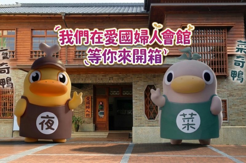 菜奇鴨與夜奇鴨是臺南市市場超人氣吉祥物,前者活潑白天形象,後者展現夜晚神秘魅力,深受民眾喜愛。此次進駐愛國婦人會館,推出相關玩偶與周邊商品,強化IP影響力。
